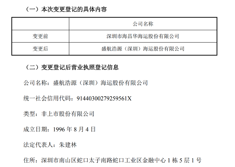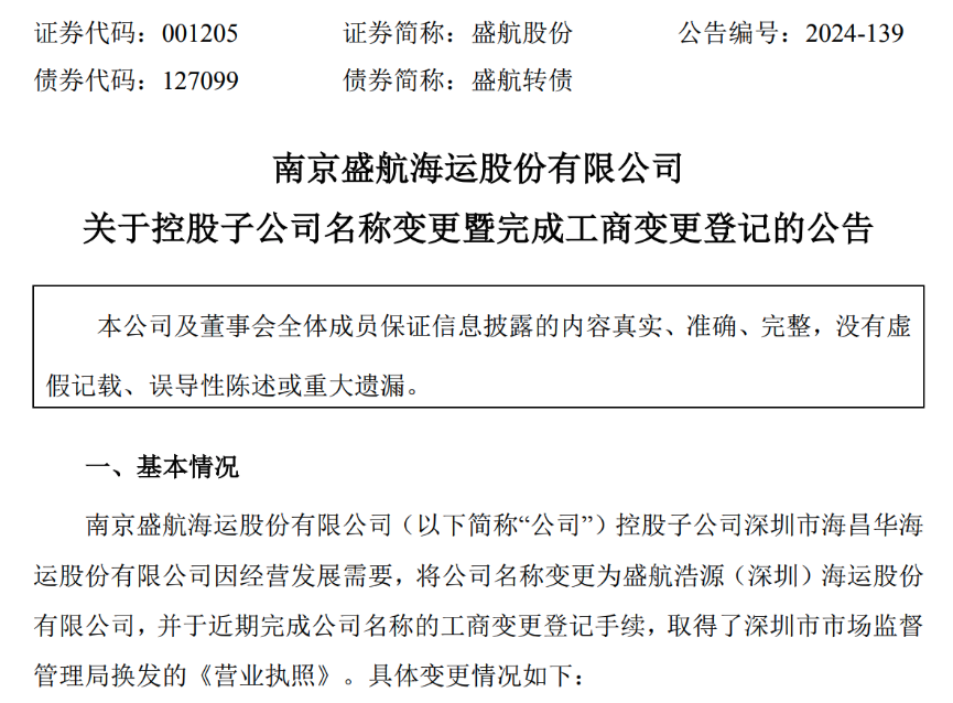 9月3日,南京盛航海运股份有限公司(以下简称“盛航股份”)发布公告,公司控股子公司深圳市海昌华海运股份有限公司(以下简称“海昌华”)因经营发展需要,将公司名称变更为盛航浩源(深圳)海运股份有限公司,并于近期完成公司名称的工商变更登记手续,取得了深圳市市场监督管理局换发的《营业执照》。