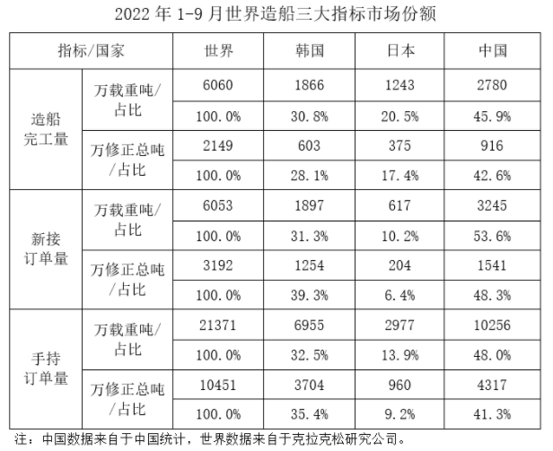 1-9月,我国造船完工量、新接订单量、手持订单量分别占世界市场份额的45.9%、53.6%和48%。
