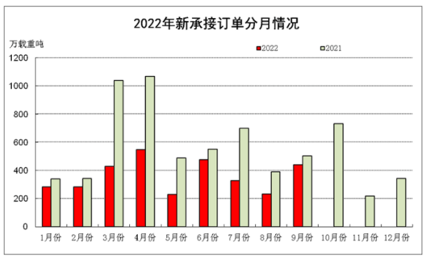 1-9月,50家重点监测的造船企业完工出口船2347万载重吨,同比下降17%;承接出口船订单2898万载重吨,同比下降39.7%;9月末手持出口船订单9129万载重吨,同比增长12.7%。出口船舶分别占重点造船企业完工量、新接订单量、手持订单量的89.0%、95.1%和91.8%。