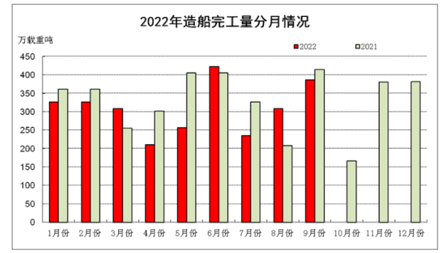 1-9月,50家重点监测造船企业造船完工2638万载重吨,同比下降10.8%。承接新船订单3048万载重吨,同比下降42.2%。9月底,手持船舶订单9947万载重吨,同比增长9.6%。