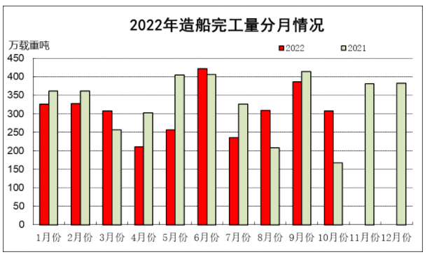 1~10月,全国造船完工量1035万修正总吨,同比增长12.7%;新承接船舶订单量1738万修正总吨,同比下降19.5%。截至10月底,手持船舶订单量4396万修正总吨,同比增长20.1%。