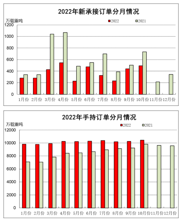 1~10月,全国造船完工3087万载重吨,同比下降3.6%。承接新船订单3740万载重吨,同比下降39.2%。10月底,手持船舶订单10444万载重吨,同比增长6.5%。