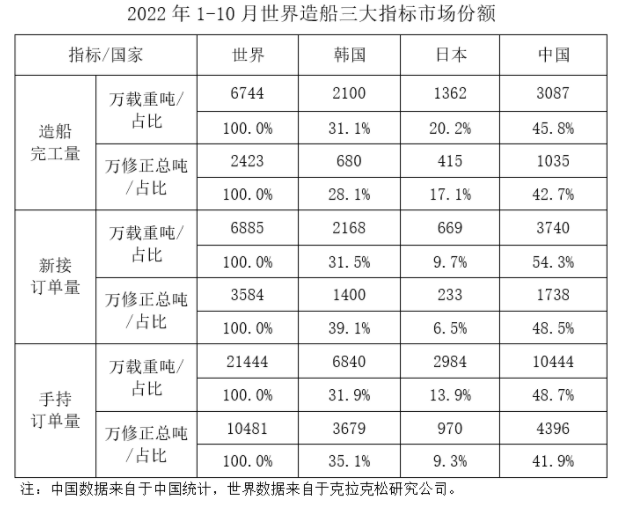 1~10月,我国造船完工量、新接订单量、手持订单量分别占世界市场份额的45.8%、54.3%和48.7%。